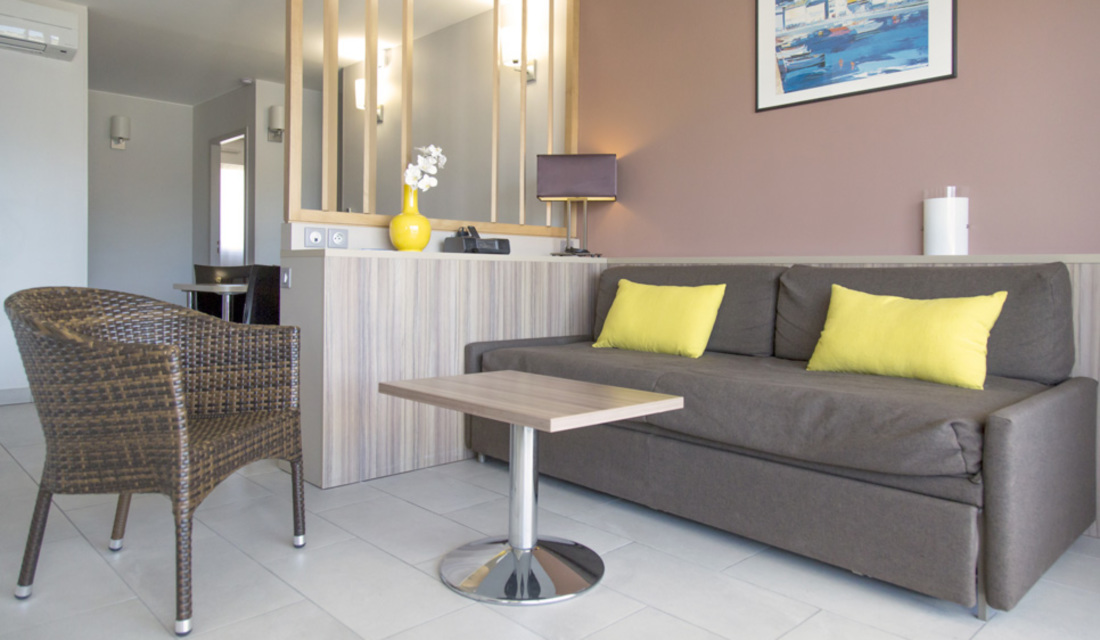 This apartment, which has 80m² of living space and a covered terrace, has three double rooms and can host up to eight people (three bedrooms with either a 160cm bed or two 90cm beds, with two 90cm trundle beds in the lounge). There are two LCD televisions and a safe in the apartment, and each room has large wardrobes, a luggage rack and a desk.